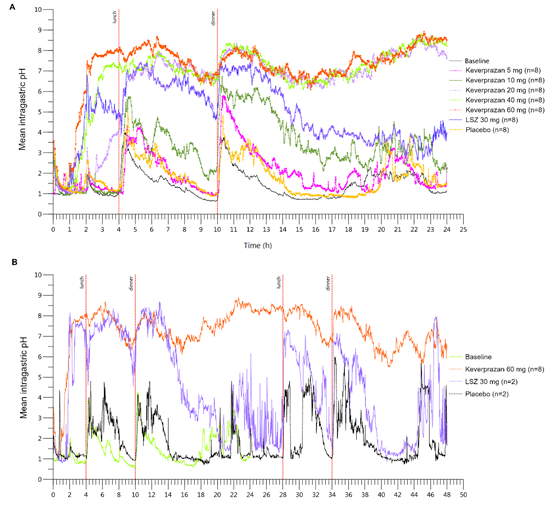 图1. 服用5mg-60mg 盐酸凯普拉生、30mg 兰索拉唑或安慰剂后,(A)24h内平均胃内pH -时间曲线,(B)48h内平均胃内pH -时间曲线