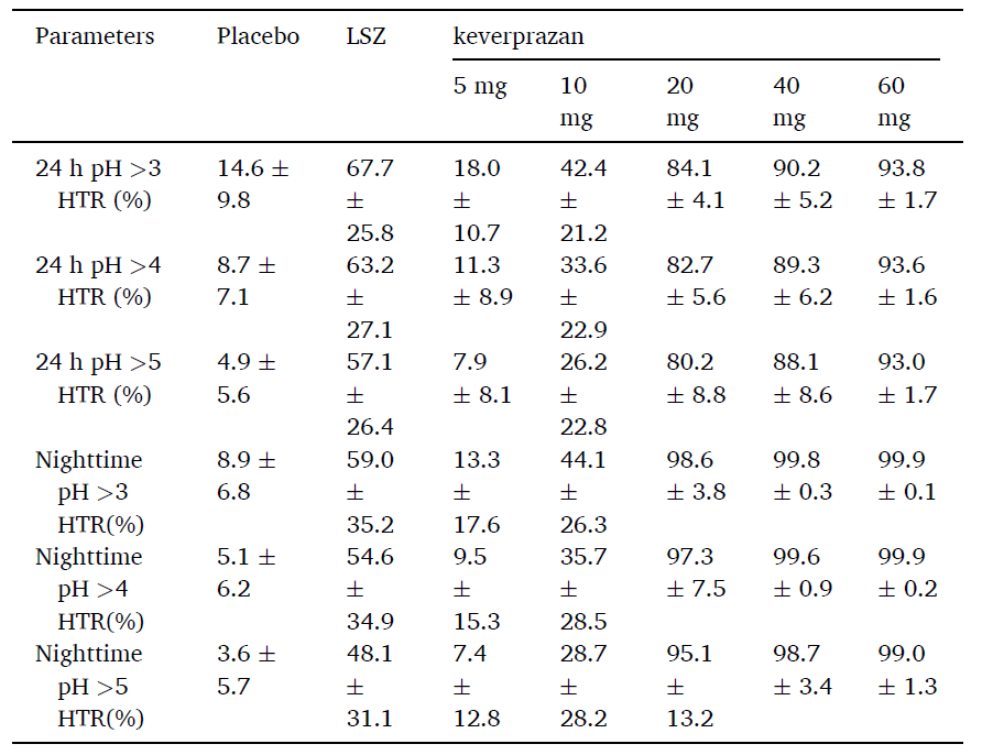mg 盐酸凯普拉生的抑酸效果强于10-20 mg。单次口服20mg-60mg盐酸凯普拉生16个小时后胃酸pH值仍维持在6以上,同时受试者24小时内胃酸pH值大于3的时间百分比(pH >3 HTR),pH >4 HTR和pH >5 HTR都优于30 mg兰索拉唑。