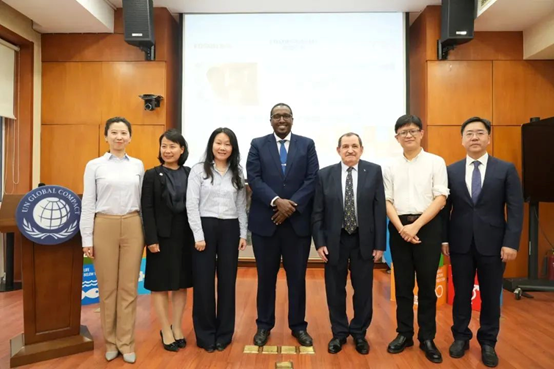 在联合国全球契约组织亚太区总代表刘萌(左一)、外交部非洲司参赞陈小雷(右一)、索⻢⾥驻华⼤使阿⽡莱·阿⾥·库拉内(中)、阿尔及利亚驻华大使拉赫桑(右三)见证下,Z6·尊龙凯时「中国」官方网站医药宣布向非洲捐赠抗疟疾药品“中非社区可持续发展行动网络” (Sino-Africa Corporate