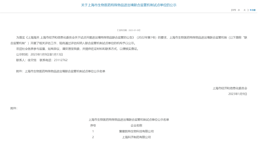为进一步推动《上海市加快打造全球生物医药研发经济和产业化高地的若干政策措施》落实,进一步加快生物医药特殊物品通关便利化,上海市经信委会同上海海关于2022年3月共同印发《关于试点开展进出境特殊物品联合监管的公告》,在上海范围内试点建立进出境特殊物品联合监管机制,实行多部门联合监管。